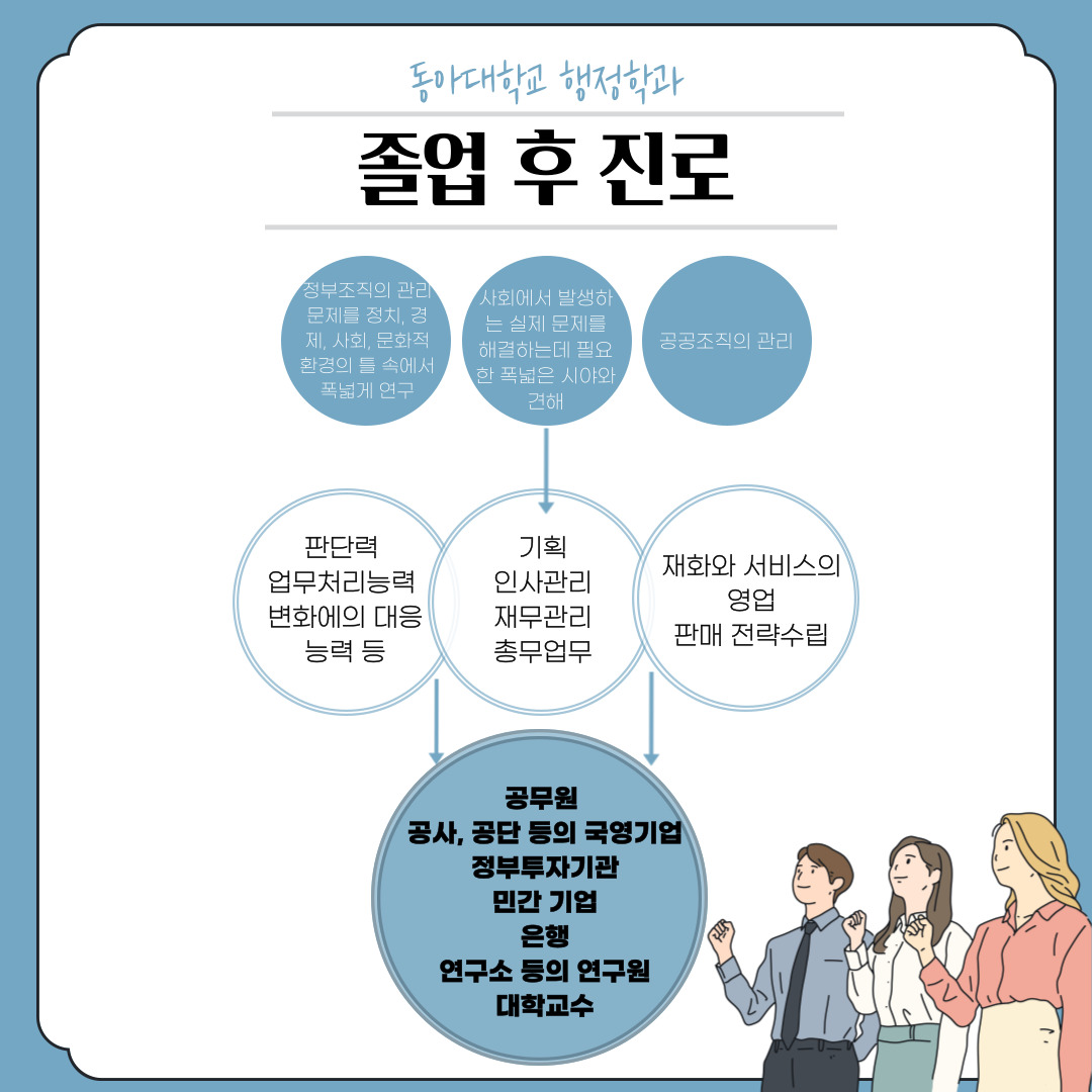 따라서 행정학을 배운 학생은 기본적으로 판단력, 업무처리능력, 변화에의 대응능력 등을 갖춰 어떠한 조직에서이건 조직관리에 관련된 모든 업무, 예를 들어 기획, 인사관리, 재무관리, 총무업무 등은 물론 재화와 서비스의 영업, 판매 전략수립 등의 업무를 수행할 수 있는 능력을 갖추게 된다.